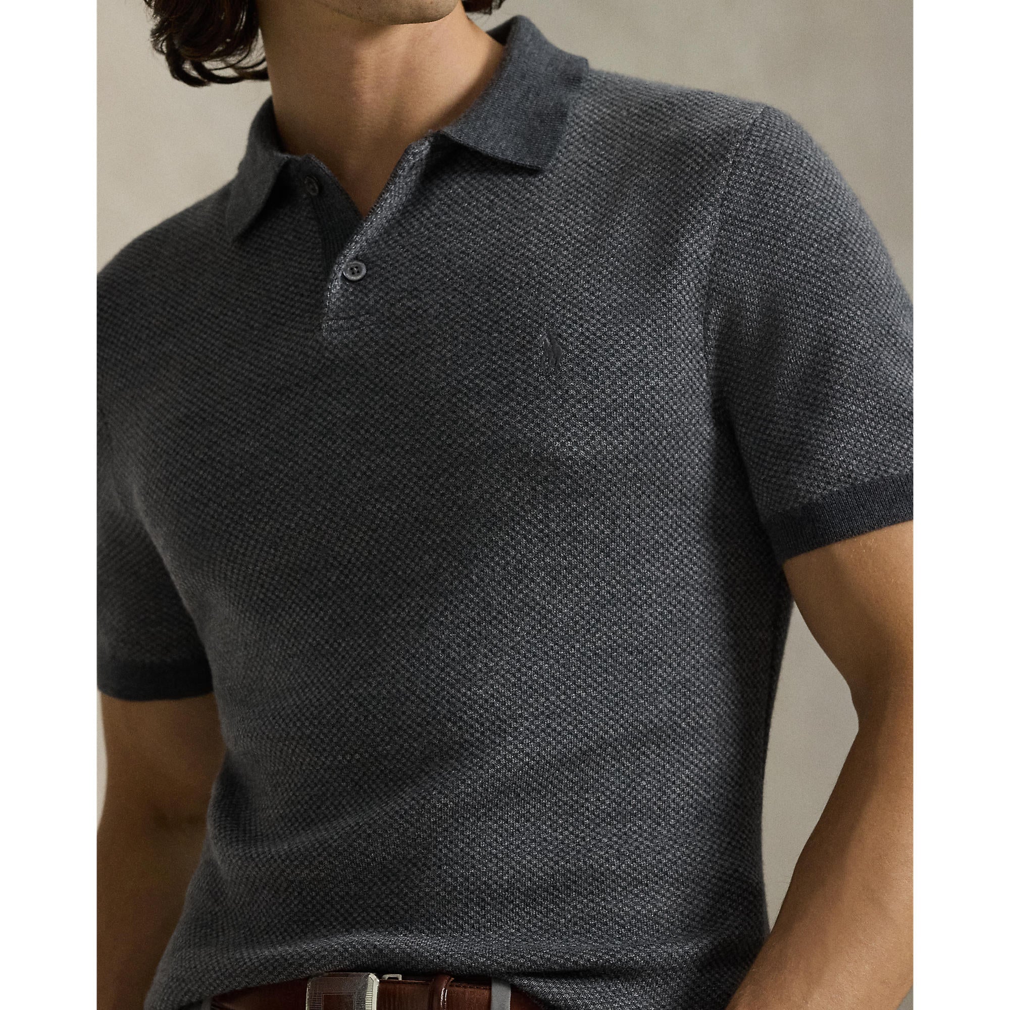 Polo-Style Details: Rib-knit collar with a two-button placket featuring genuine mother-of-pearl buttons custom-developed with the “RLX Ralph Lauren” logo.