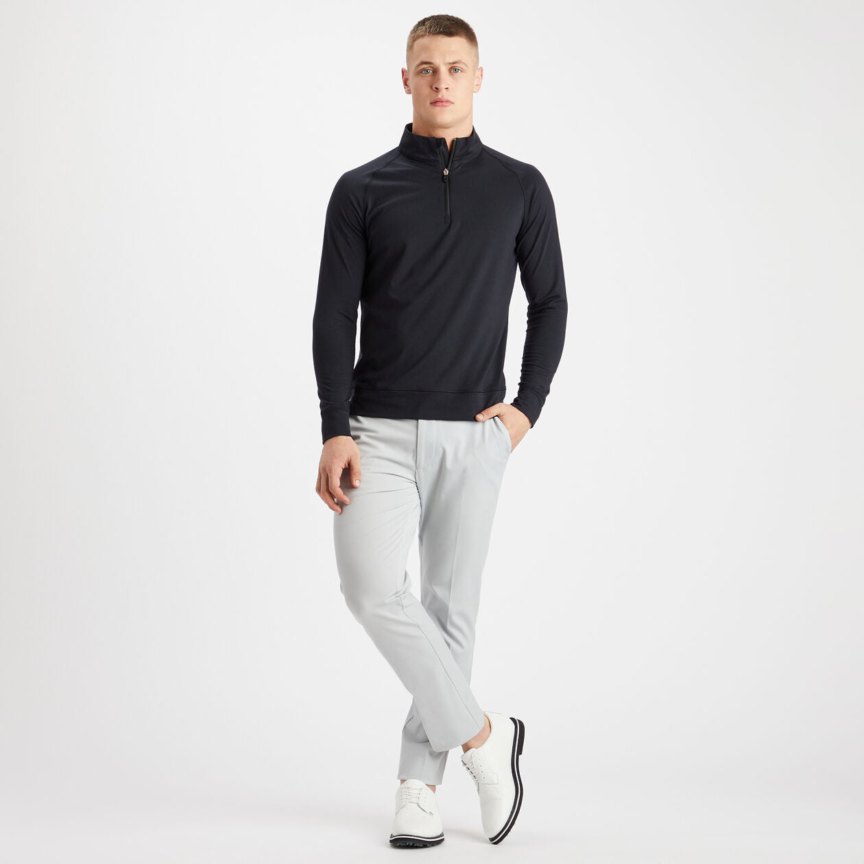 Nag-aalok ang lagda ng midlayer na ito ng nakataas na istilo para sa parehong on & off-course na may banded hem na nagdedetalye, Raglan Sleeves, at isang Technical Jersey timpla para sa isang ugnay ng Luxe. Magagamit sa mga staple colourways upang gawin ang piraso na ito sa isang buong taon na paborito.