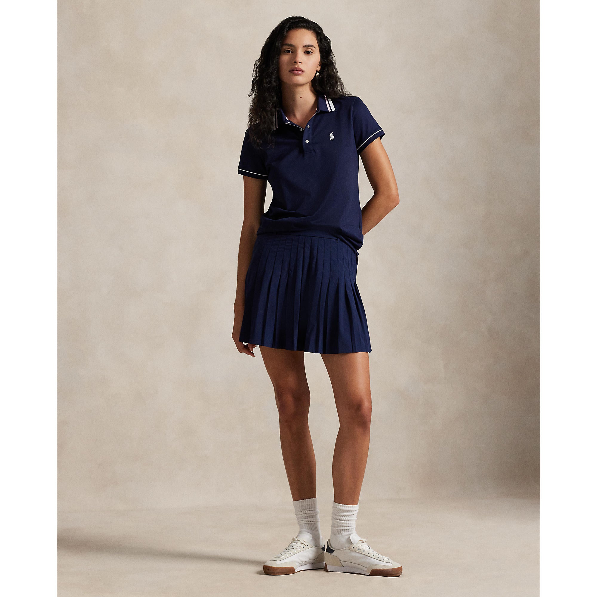 Mga naka-istilong kwelyo at pagdedetalye: rib-knit polo kwelyo na may guhit na tipping, three-snap placket na may rlx-ukit na metal snaps, rib-knit cuffs na may piped inset na detalyado