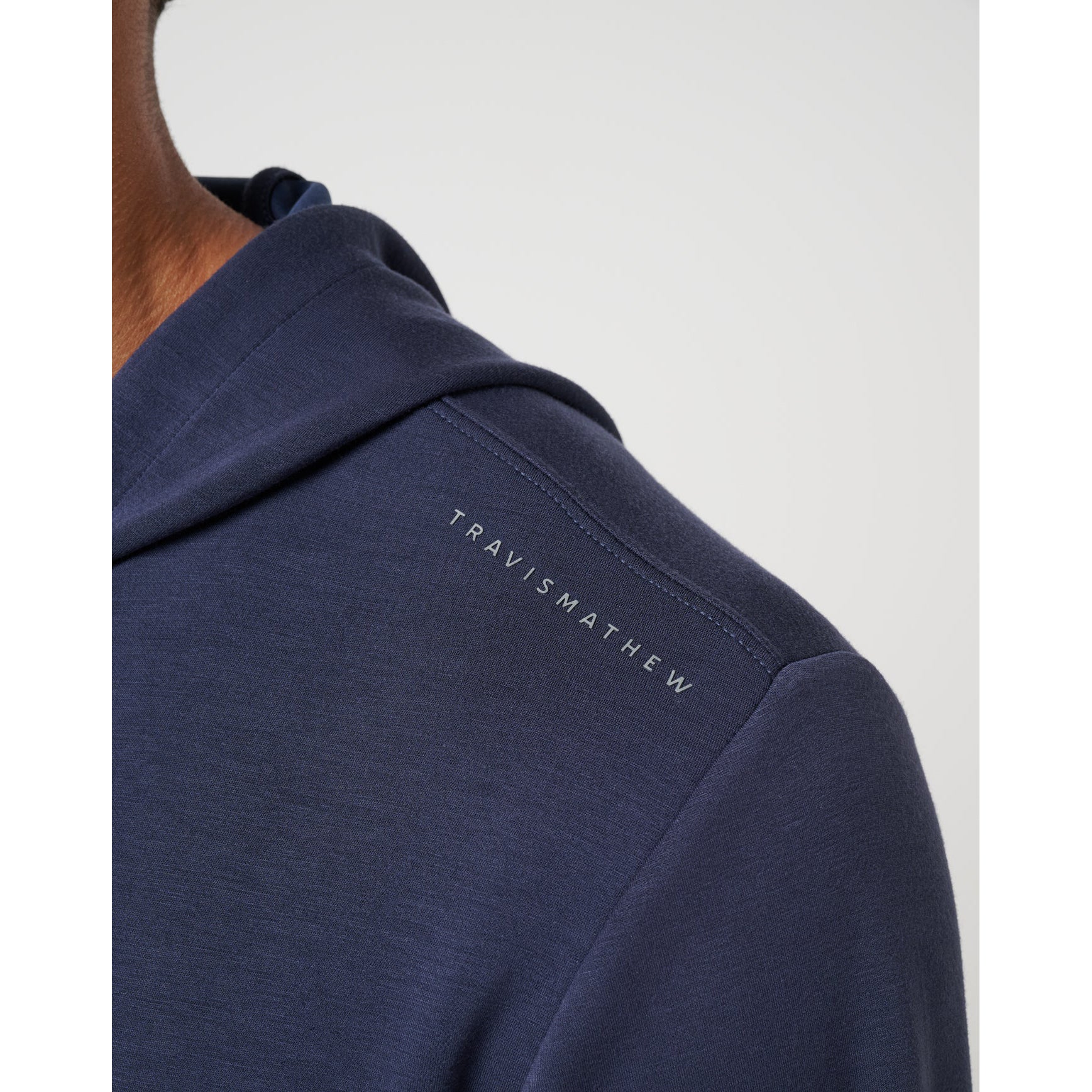 Signature Branding: HD TravisMathew block logo across the top shoulder seam