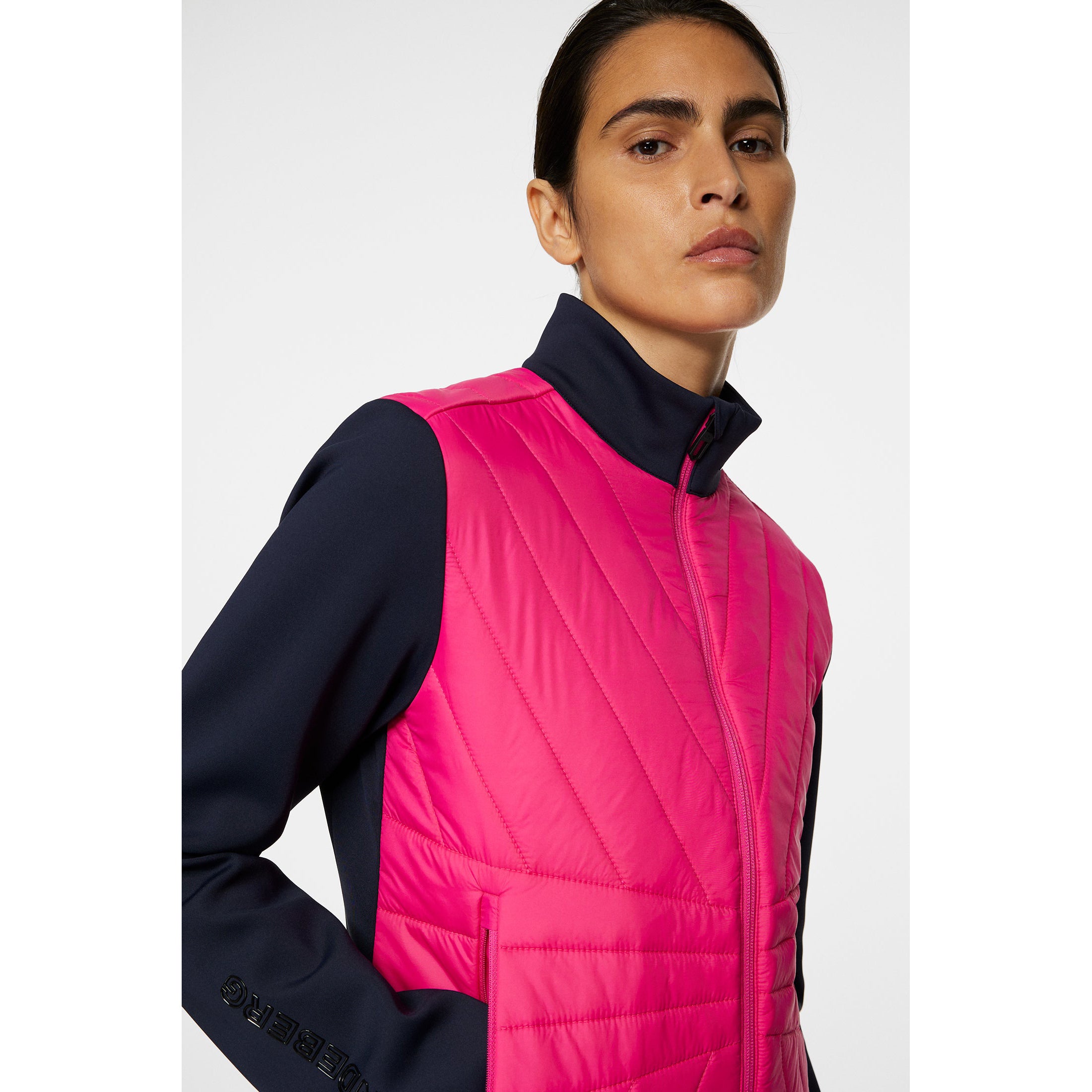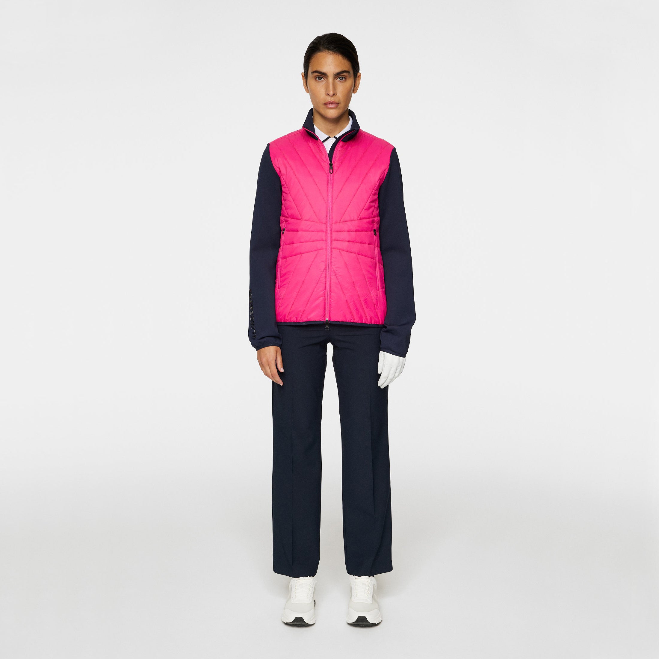 -Two Way Vislon Front Zipper aan het midden van de voorkant -Vislon Zip op borstzak. -Stay Down Pullers -Jl Bridge -logo bij kraag -J.lindeberg print op mouw -Elastische binding aan onderste en bovenste kraag, -Water Werende quiltonderdelen -Soft en elastisch voor comfortabel dragen. -Soft en rekbaar -snel droog