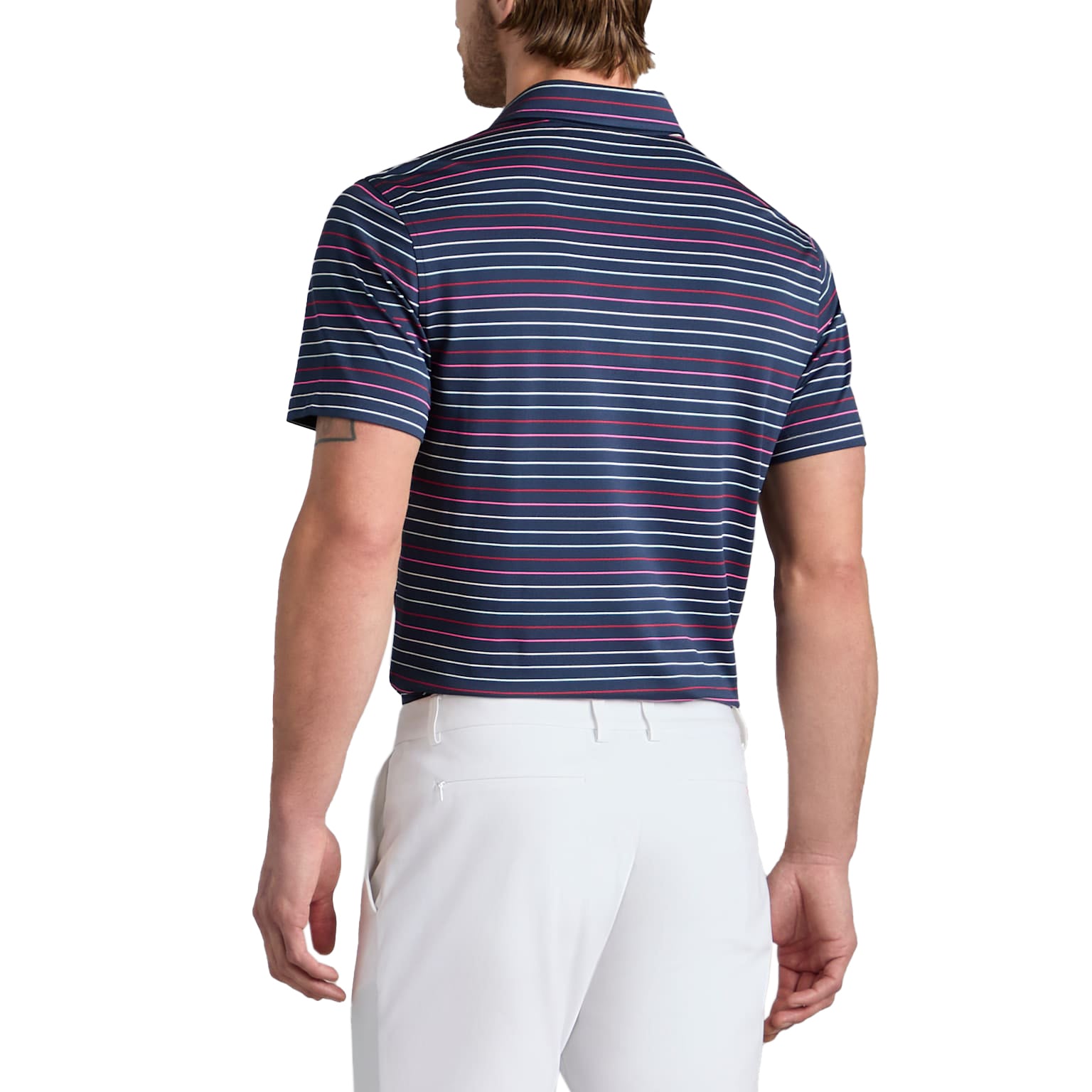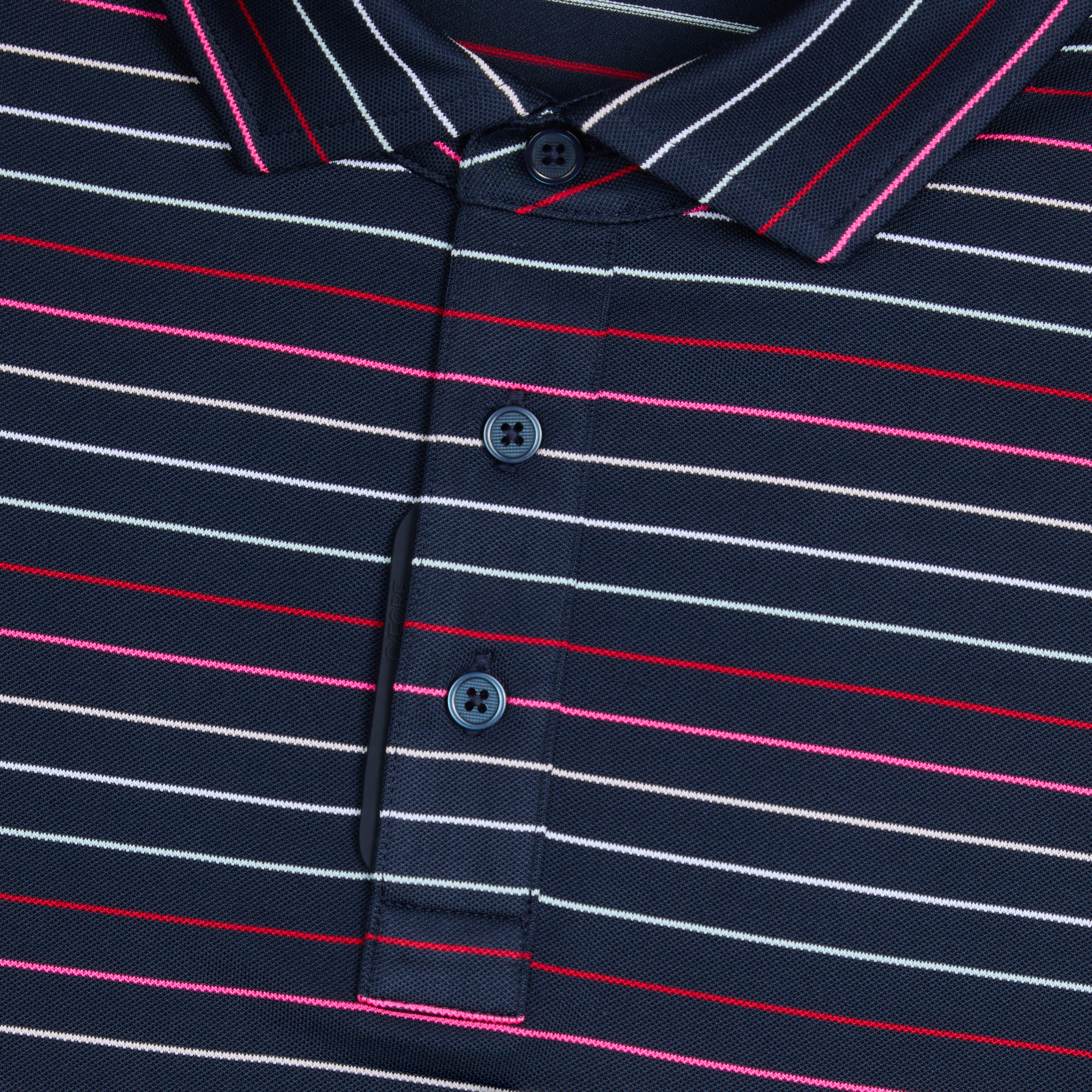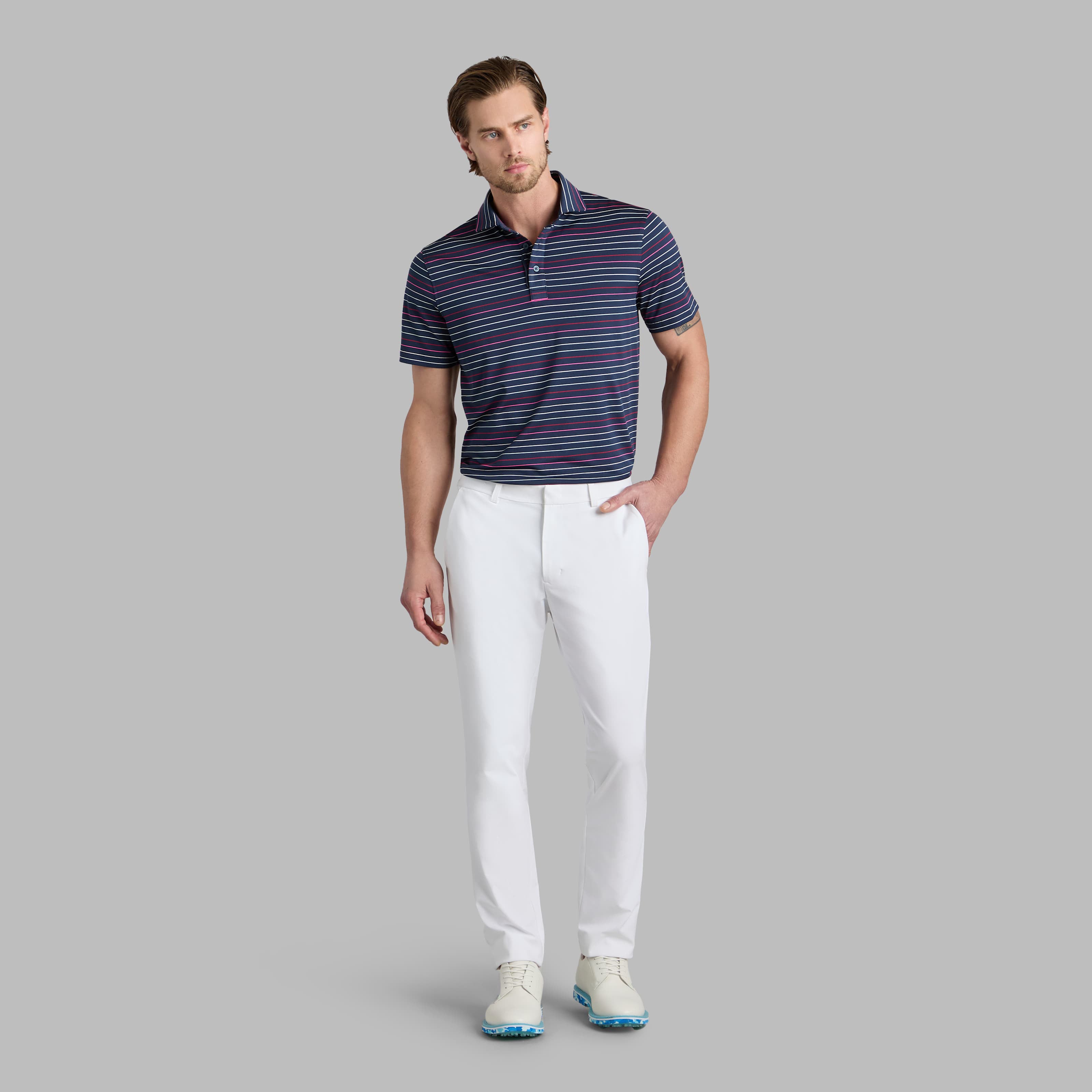 FEATURING MULTI-COLOURED STRIPES, THIS TECH PIQUÉ POLO IS THE ULTIMATE EVERYDAY ESSENTIAL FOR DAYS AT THE CLUBHOUSE, THE COURSE, AND IN BETWEEN. MADE OF BREATHABLE TECH PIQUÉ FABRIC WITH MOISTURE WICKING BENEFITS AND UNBEATABLE 4-WAY STRETCH, IT'S A MUST-HAVE FOR ANY GOLFER'S CLOSET. TUCK INTO A PAIR OF OUR TOUR 5 POCKET PANTS FOR AN EFFORTLESS LOOK ON THE GREENS.